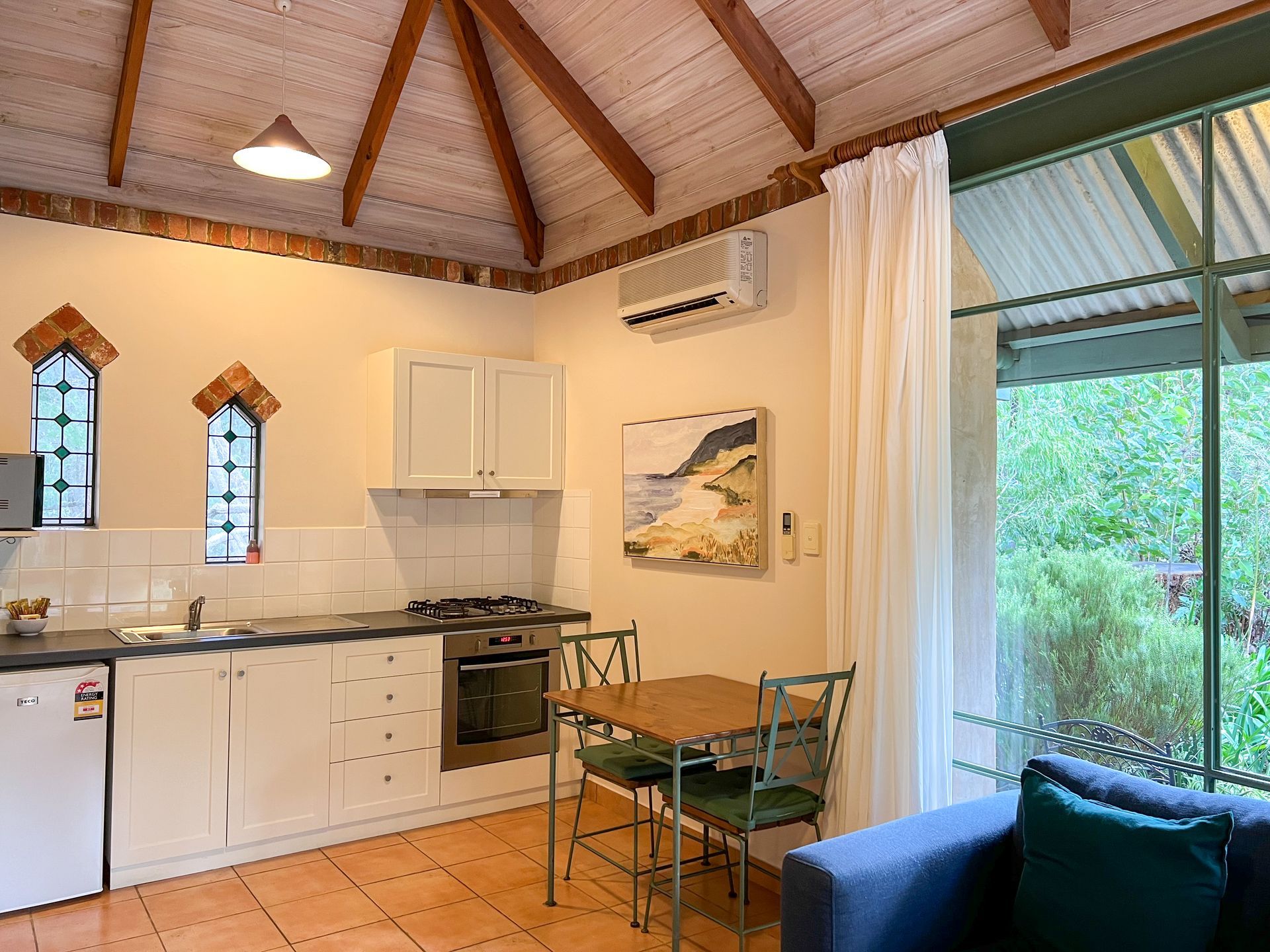 The four fully self-contained studio cottages have garden views and are in sets of two and designed for couples only, with a queen bed in the living/kitchen area. There is a comfortable sofa, table & chairs, full cooking facilities, under bench fridge and separate bathroom with shower. Outside, there are tables and chairs on the covered veranda. All cottages have satellite television and DVD/CD players. Please note no children or infants are permitted in these cottages.