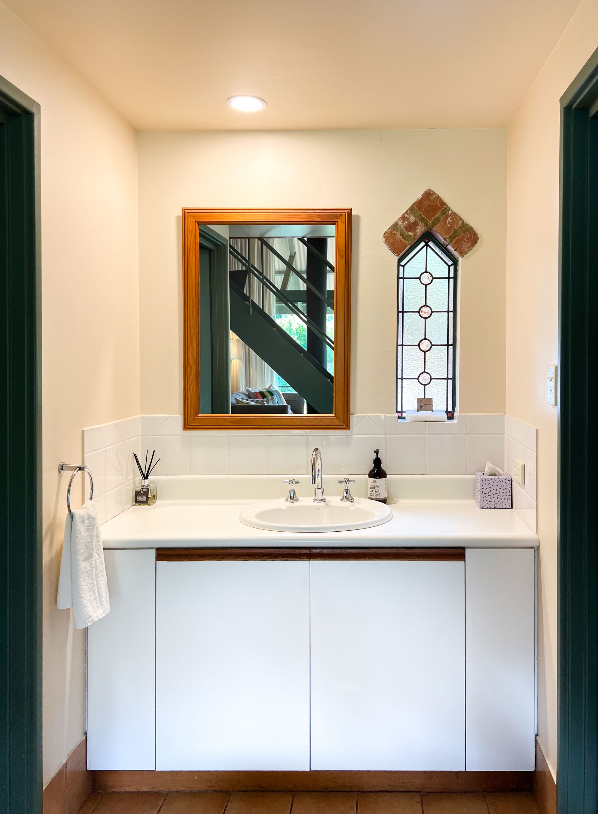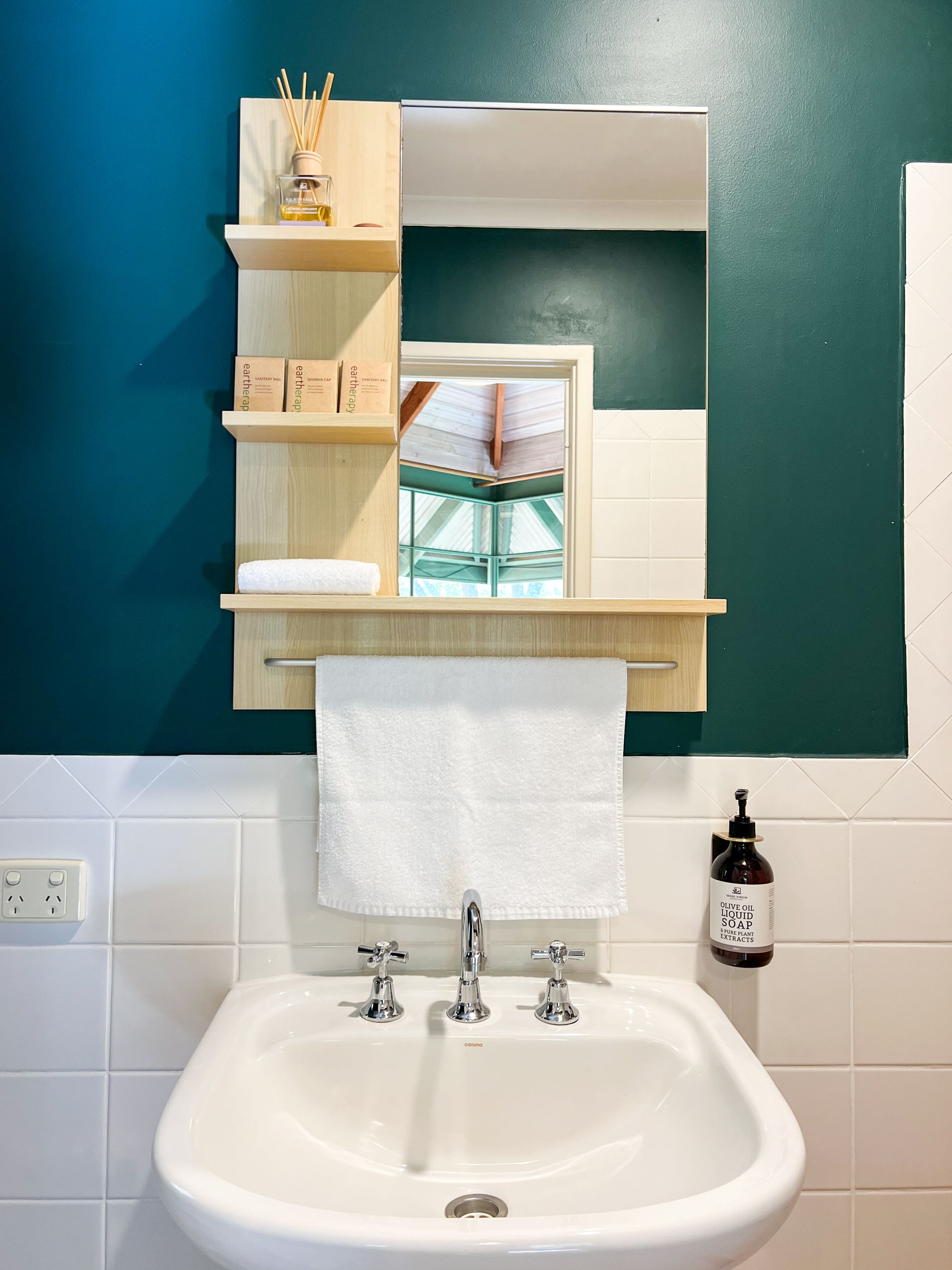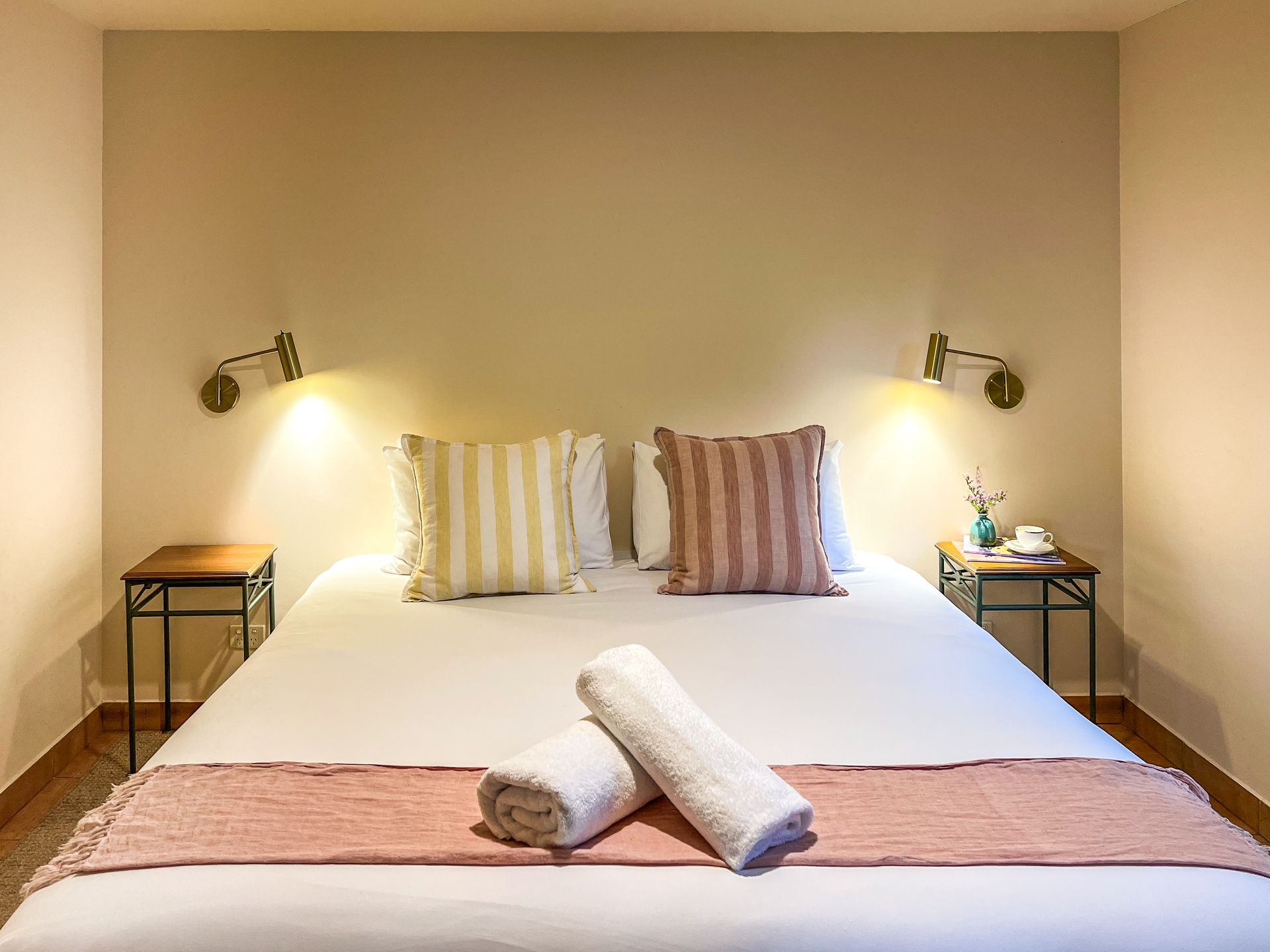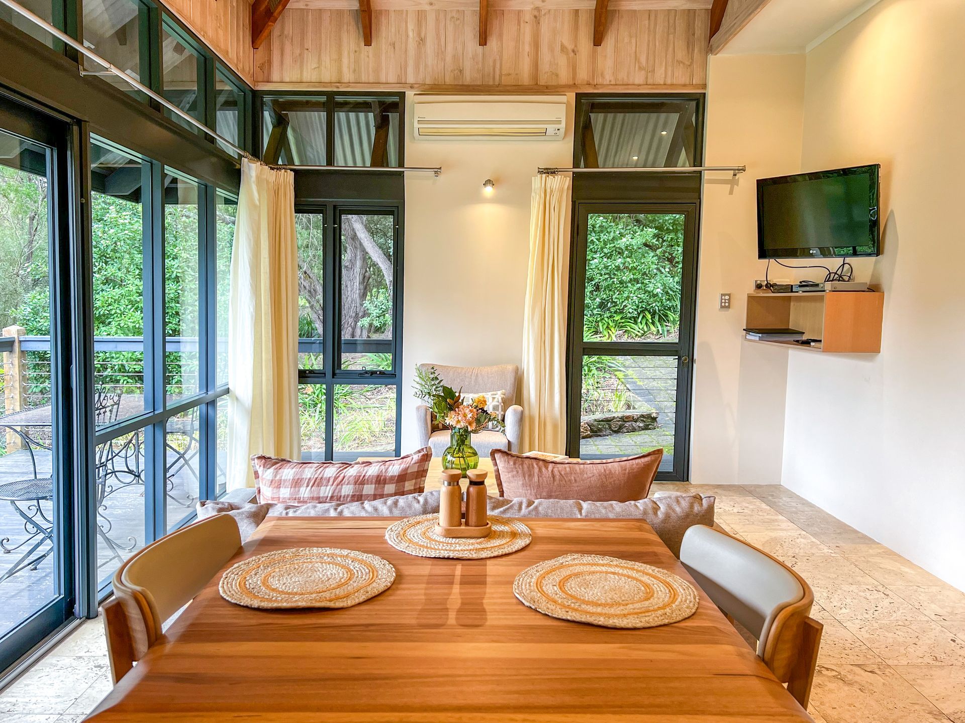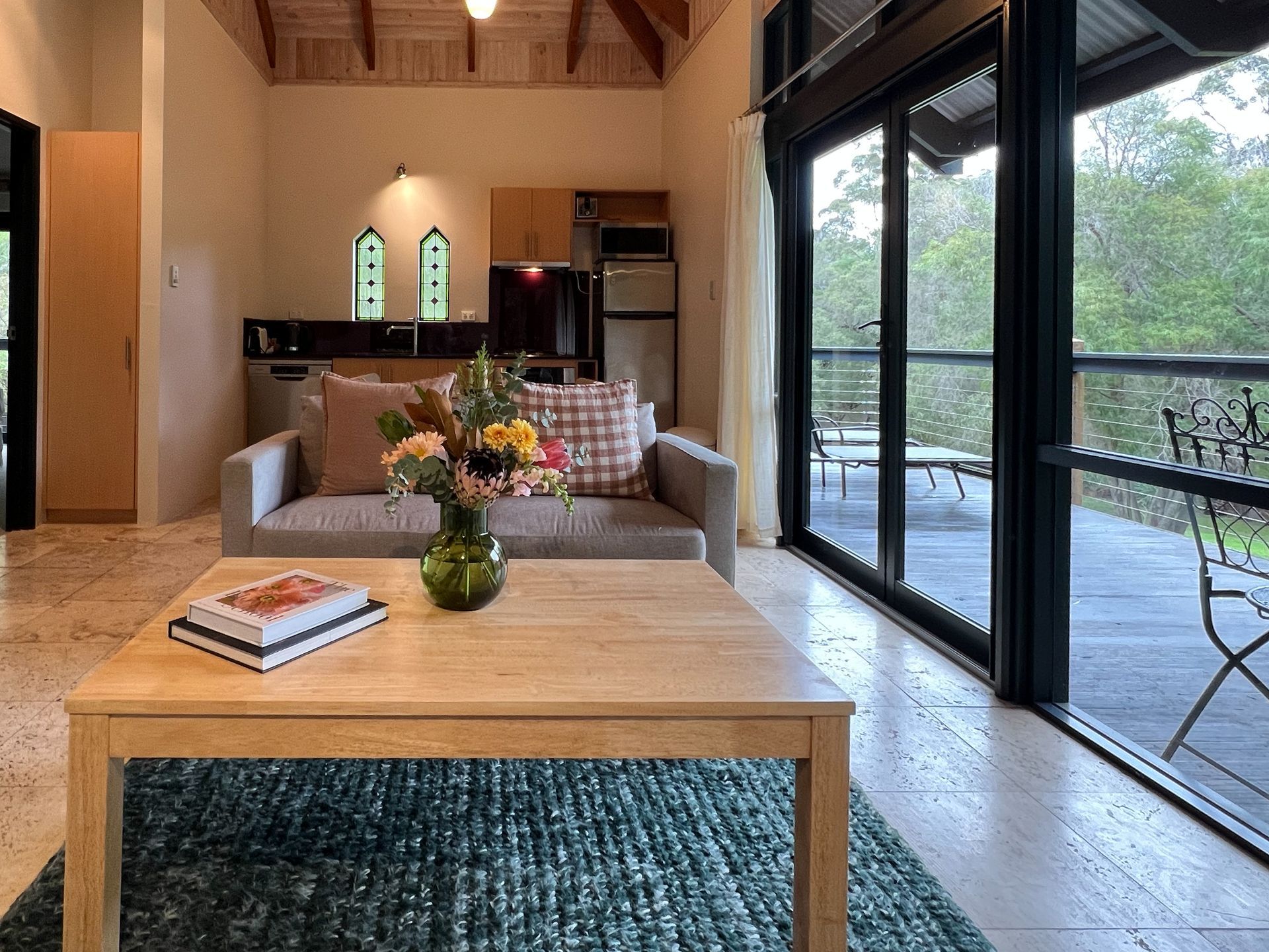 The separate, softly carpeted bedroom with king bed can be accessed from the bathroom or living area and has a feature wall with concealed lighting. French doors open out onto the deck to greet the morning silence.