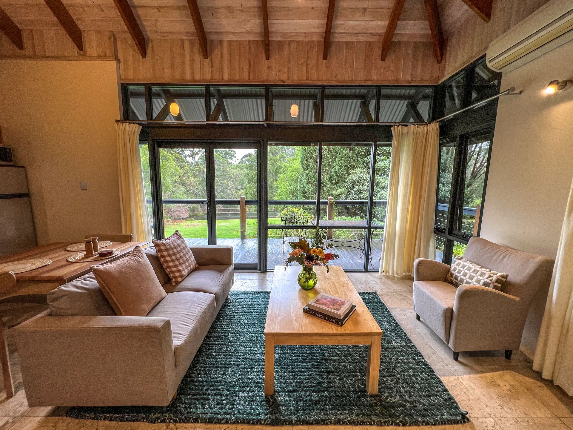 The four family cottages are suitable for couples, groups of friends or families and are very private, with lake or waterfall views. Features include a spacious and furnished open plan living/dining/kitchen area on the ground floor, 2 large sofas, coffee table and a dining table & chairs for 6. They have flat screen TVS, DVD/CD players and potbelly fires. The living area has French doors opening out onto the large paved and covered veranda with a jarrah table and benches overlooking the gardens and lake or waterfall. Kitchen facilities include a full-size fridge, dishwasher, 4 burner gas hotplate, oven, microwave.